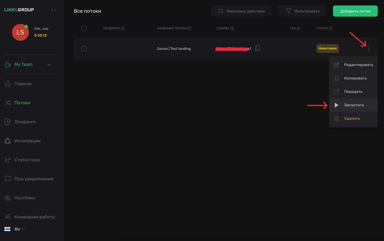 Для того чтобы активировать поток нужно - нажать на 3 точки и далее на кнопку Запустить