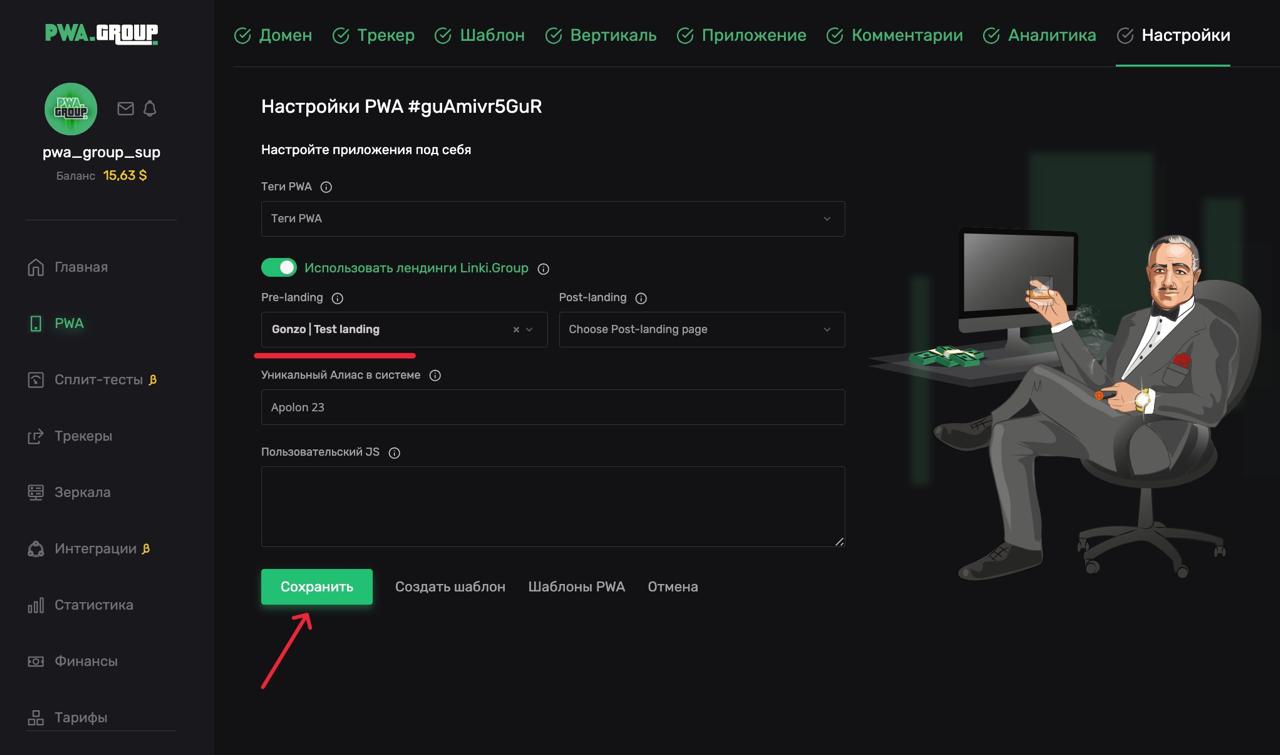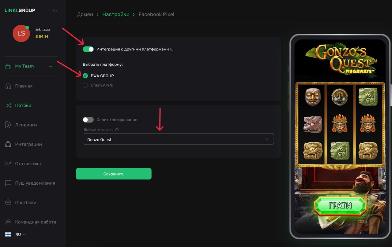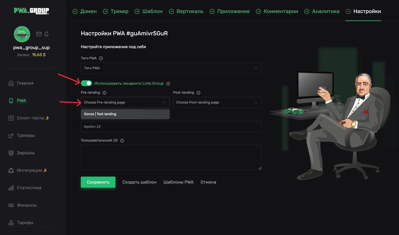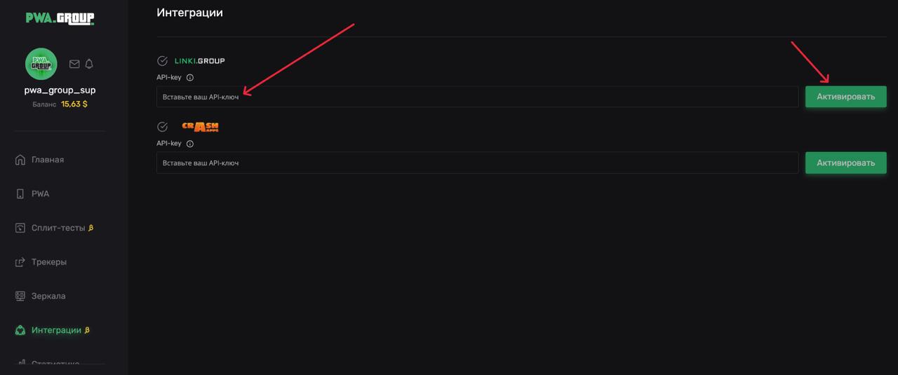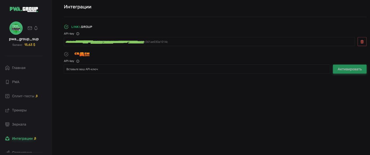 Включаем опцию Интеграция с другими платформами и выбираем PWA.GROUP.
