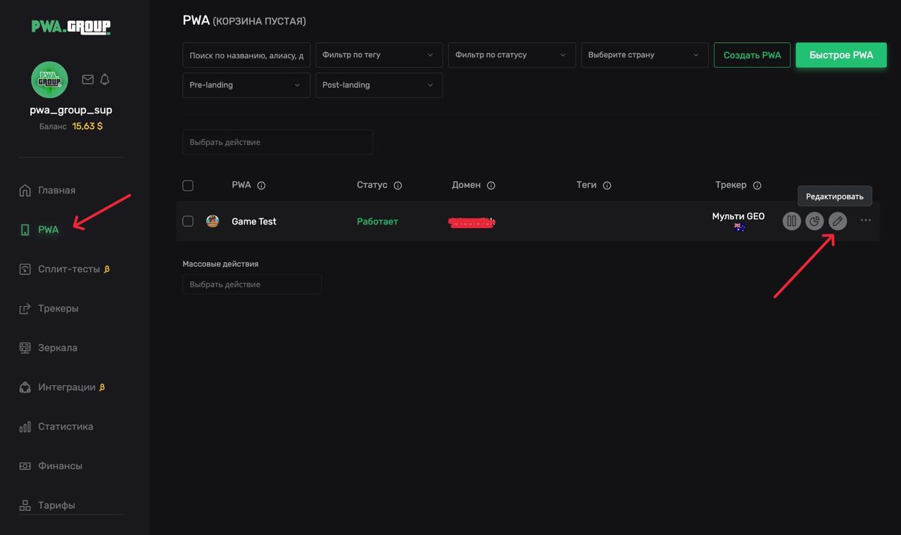 Переходим в редактирование нужной нам PWA → во вкладку Настройки.