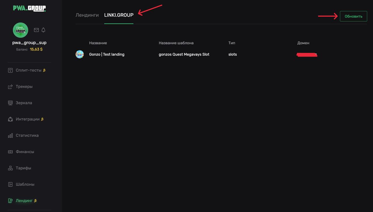 Переходим во вкладку LINKI.GROUP и нажимаем Обновить.