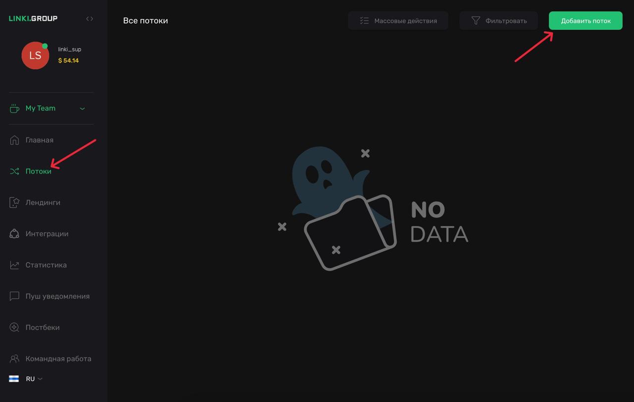Переходим в раздел Потоки и нажимаем кнопку Добавить поток.